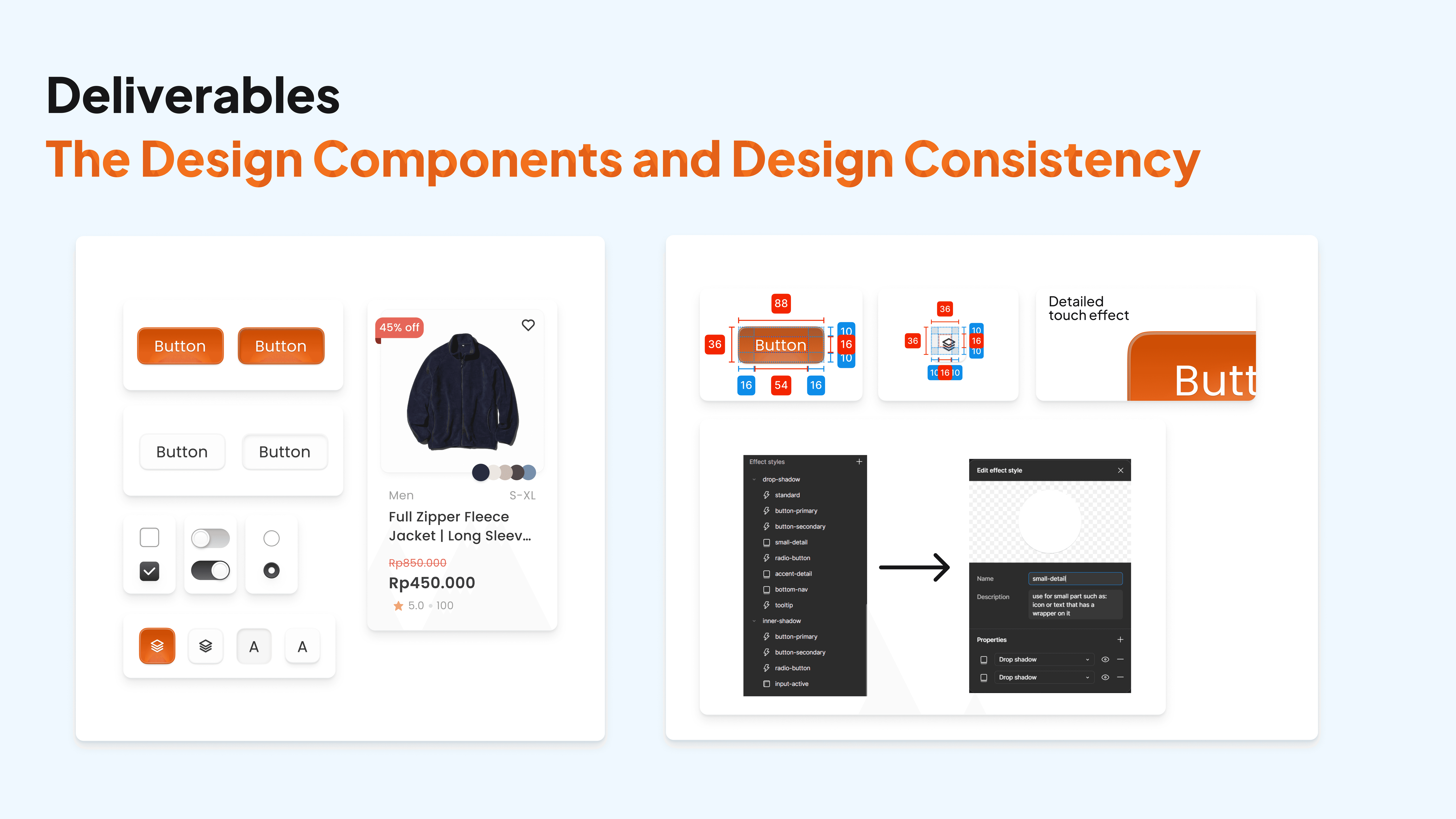 After establishing the design style and foundation, the next step in delivering the design was creating the design components. These components follow a minimalist style with subtle skeuomorphic touches and accent details. They are used consistently across screens to maintain visual harmony and reduce design complexity.